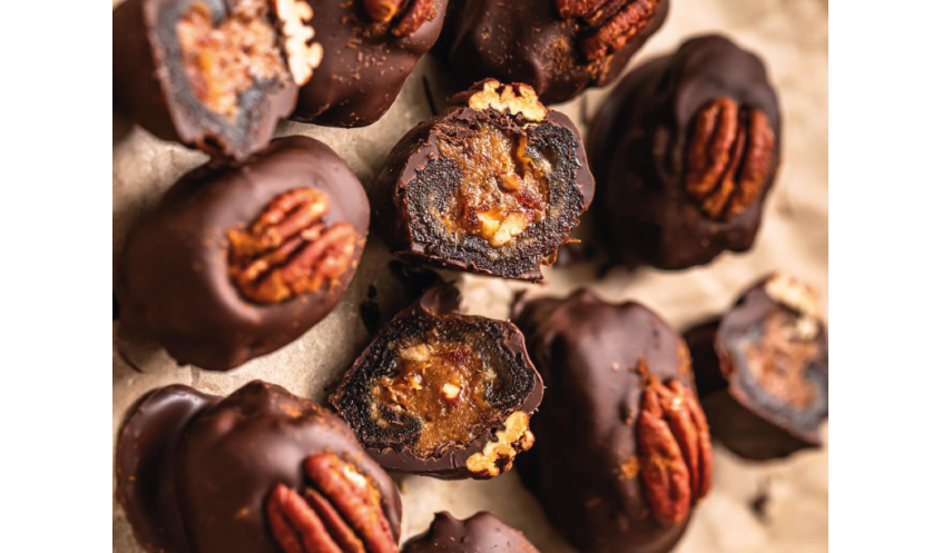 Découvrez notre recette simple et festive avec dattes Medjool bio, amandes bio, chocolat noir 60 % Bio de Manon et autres fruits secs de votre boutique.