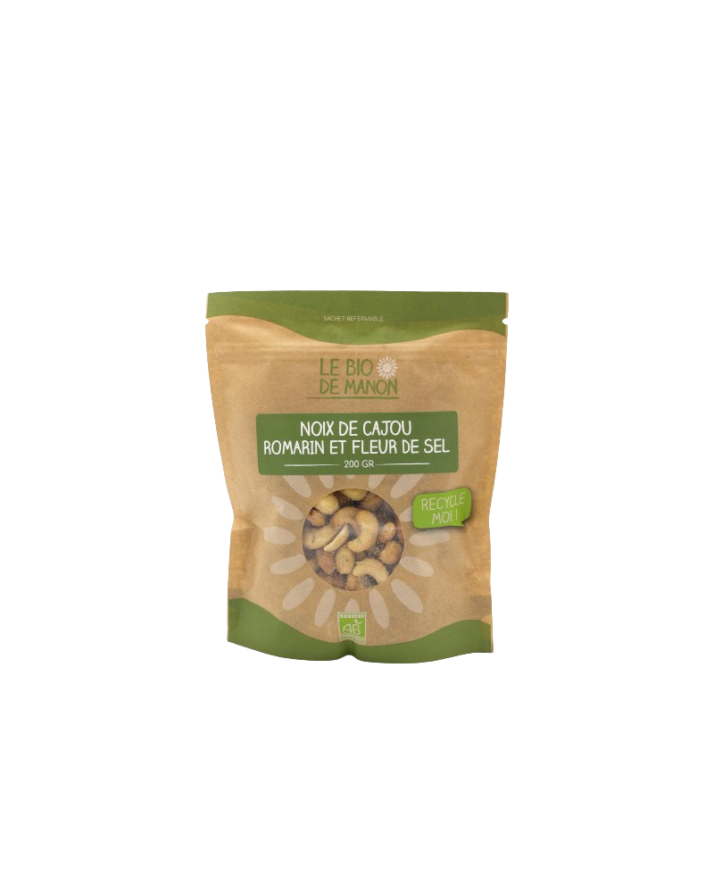 Nos noix de cajou au romarin & fleur de sel sont 100 % bio, sans additifs ni conservateurs, garantissant une qualité optimale et un goût authentique.