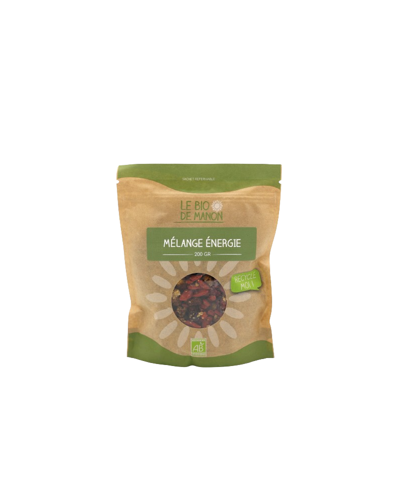 Le Mélange Énergie est 100 % bio, sans additifs ni conservateurs, c’est une collation saine et joyeuse qui fait autant plaisir au corps qu’aux papilles.