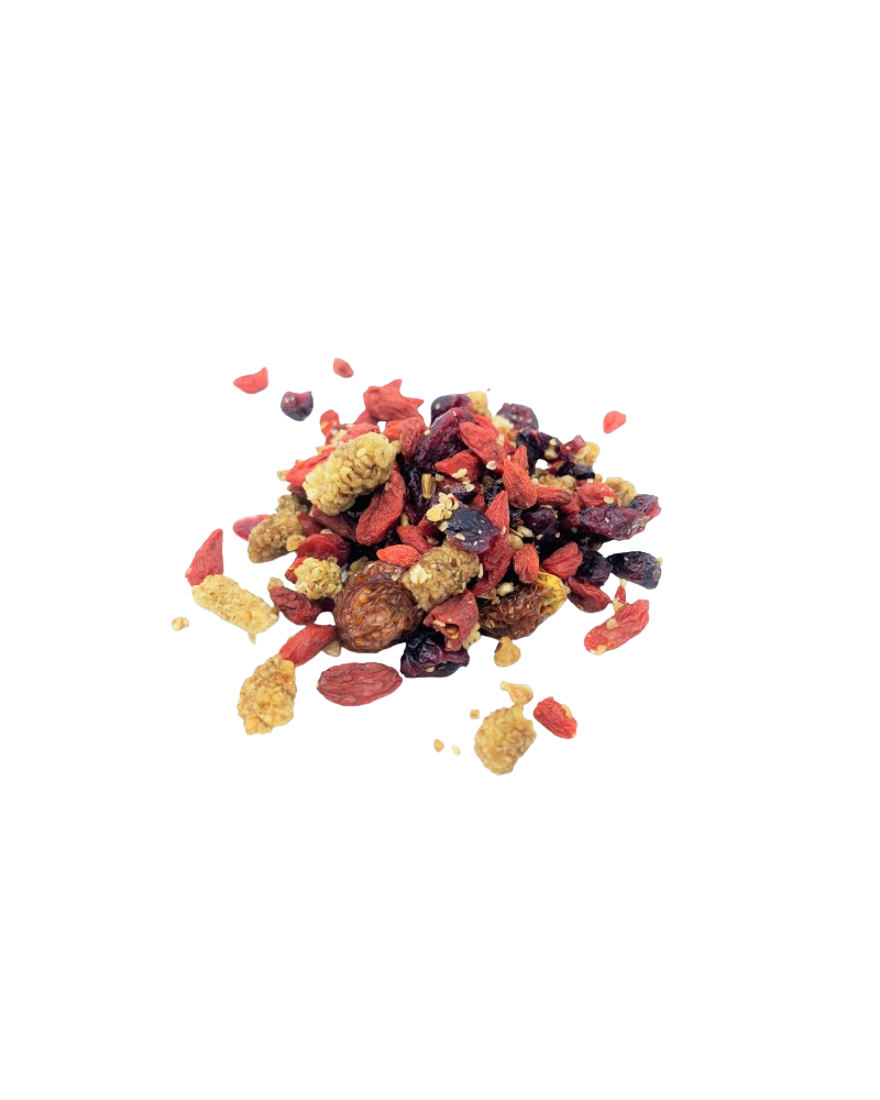 En savoir plusUn combo fruité et vitaminé qui réunit cranberries, baies de goji, physalis et mûres blanches. Un vrai concentré de peps pour vos journées actives !